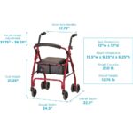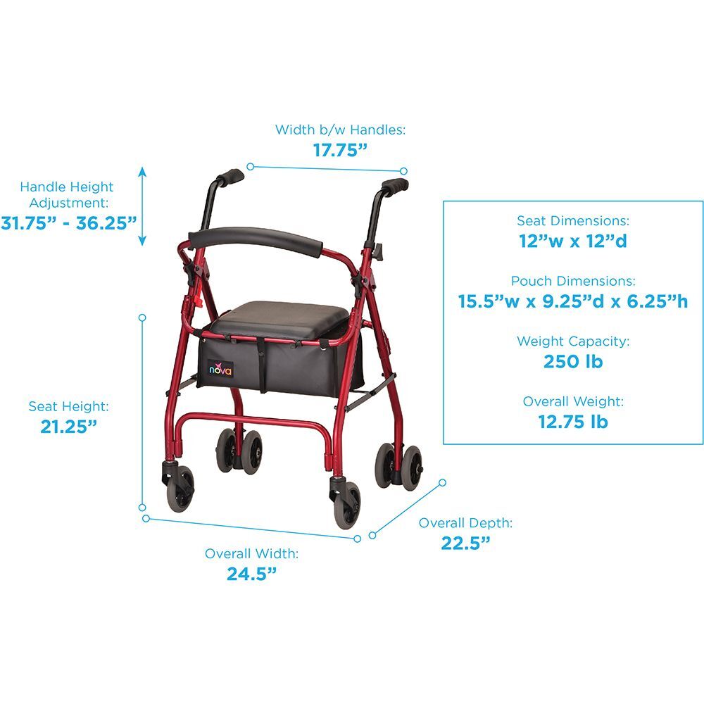 - SPECIFICATIONS: Approximate user height of 5’3″ – 6’0″; Seat height is 21.25″; Weight Capacity is 250 lb.; Walker weight is 12 lb.; Handle height adjustable from 31.5″-35.25″; Width between handles: 17.5″; Overall dimensions: 24.5″W x 22.5”D