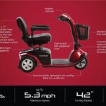 Sit comfortably in the 18-inch by 17-inch adjustable seat, which includes a pinchless hinge. It slides, letting you slide forward and backward to find just the right position. It swivels, making it easier to transfer on and off from the side of the scooter.